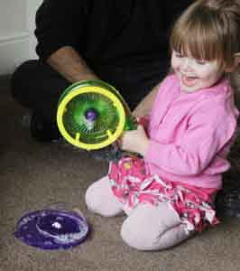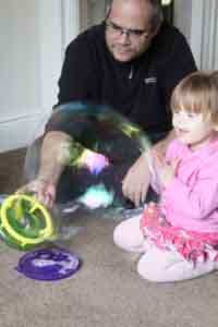 Boy does it create big bubbles too! One of the issues we have with hand held bubble wands is that Amelia tends to get a little excited and blows too hard, thus making the mix fly everywhere and no bubbles. This of course results in tears or tantrums – game over! The wand does all the work for you, you can control the flow of air with slight of hand and if you move obviously this results in longer balloons and much hilarity! Hubby was enjoying himself too much at one point that the kids had to stage an intervention to get the wand from him (I know whats on his Birthday wishlist now!)