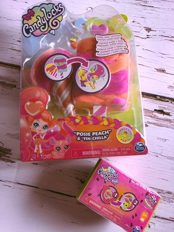 Another great toy the girls love are the Candylocks toys from Spinmaster. Candylocks are cute pixie style characters and their pets with super long, scented cotton candy hair! We received Posie Peach in one of the larger sets with her pet and also a smaller grab/blind bag.
