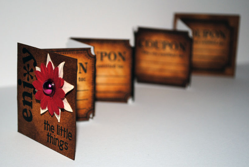 I made this little coupon book with a single coupon stamp from the set. Easy to line up on the clear acrylic block. I inked the edges with Tim Holtz distress inks in Tea Dye and Vintage Photo.