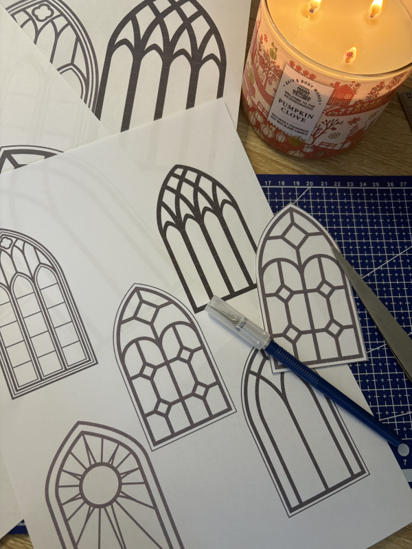 Start by sketching or printing out gothic-inspired patterns on paper. Think cathedral windows, ornate crosses, intricate lacework, or mystical symbols. I like to create three different patterns for visual interest. Search online for designs.