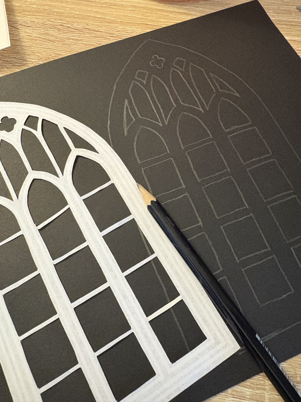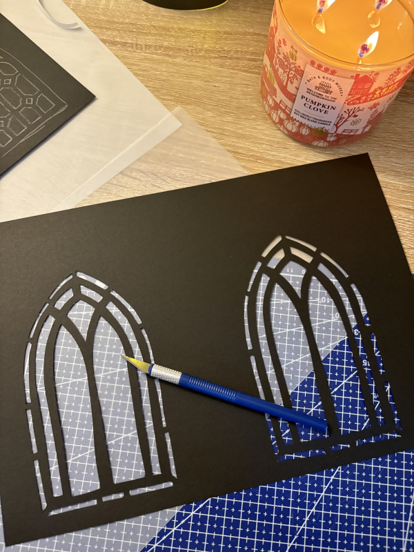 Lightly pencil your gothic patterns onto the black card, then carefully cut out the designs using your craft knife. Work slowly and keep your blade sharp – card can tear if you rush or use a dull blade. If you have a Cricut machine you can find templates on Creative Fabrica to make this step easier.