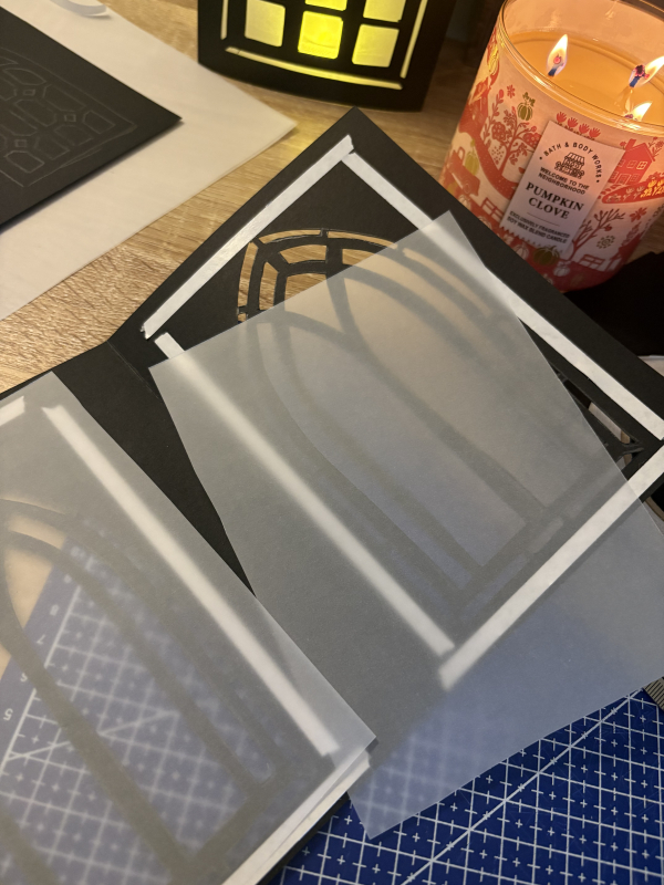 Cut your black card into rectangles: large lantern (8″ x 12″), medium (6″ x 10″), small (4″ x 8″). These dimensions create lanterns that nest beautifully together for display. The vellum is cut to the size of the window inside.