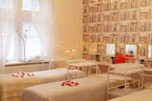The beauty school and parlour are set out in a very shabby chic style which appealed to my sense of decor straight away, the rose petal covered beds to the crystal chandeliers above each station, the cream ornate mirrors and piles of freshly fluffed white towels, it all just works together to bring a sense of peace and relaxation.