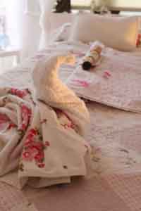 I was taken through to the separate parlour room which is set up with a bed in the middle of the room, huge armoire housing towels and skin care to one side and a nail station in the bay window. The bed was set out with petals at the foot and a origami towel swan (too cute!), there was a lovely warm glow to the room coming from a mobile heater which meant that getting semi undressed for the facial with neck, arm and hand massage was pleasant and not at all chilly as the weather outside should have dictated!