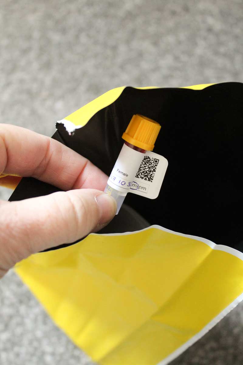 In each kit are instructions, a vial to collect the blood sample, 3 finger pricker/lancets, stickers with my details on to place on the vial and a pre paid medical envelope to return the sample.