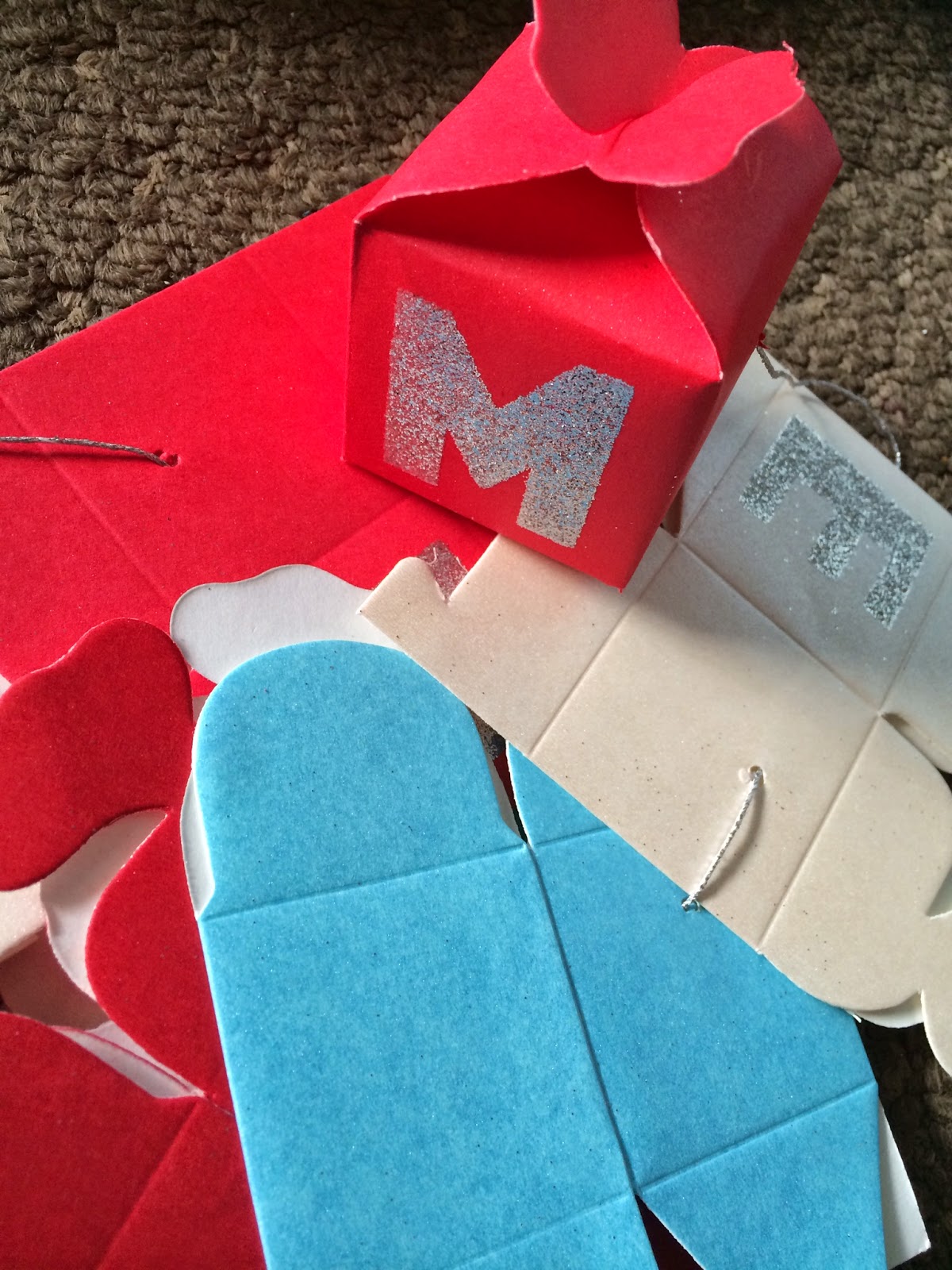 We also boughts some make your own decorations which involve putting together little boxes to create a little present bunting set – however these would be great if you are handmaking sweets or chocolates – you could present them to the recipient with their initials already glittlered onto the front of the box…..well, you could if their name starts with one of the letters in Merry Christmas! š ?