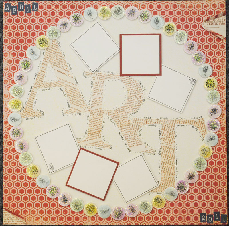 This one was where they made each stamped ‘brad’ by glossy accenting and glittering a 3/4inch circle – 45 of them in total! These were placed in each scallop of the already printed paper (this was a sheet of Christmas paper and i wanted to show you can use them all year round)