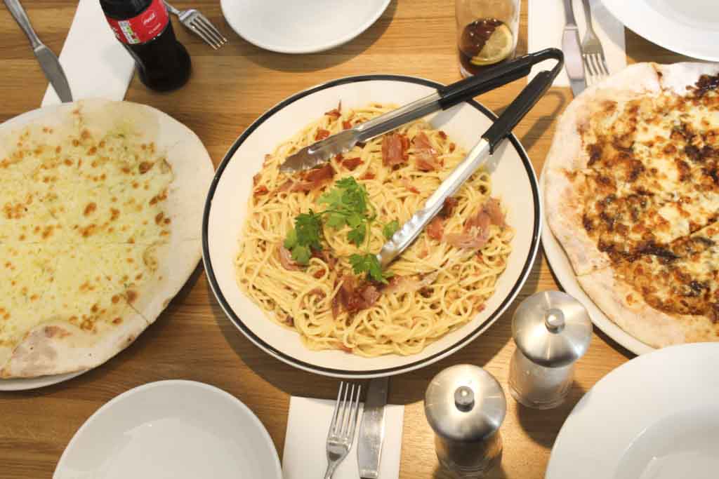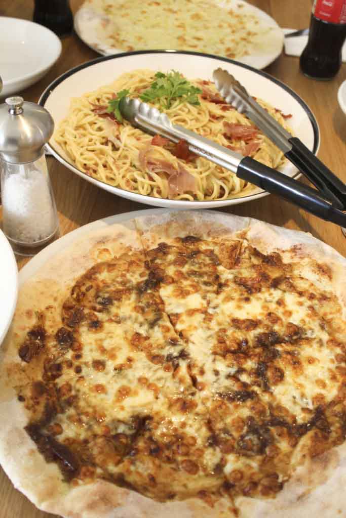It was explained to us that we would receive a sharing bowl of pasta, garlic bread and drinks, they were so lovely and could sense that we were starving and wanted to impress so brought out both the caramelised onion garlic bread (OH EM GEE- why has no one done this before!), a cheesy garlic bread for the kids, 2 bowls of chips and the family bowl of carbonara pasta.