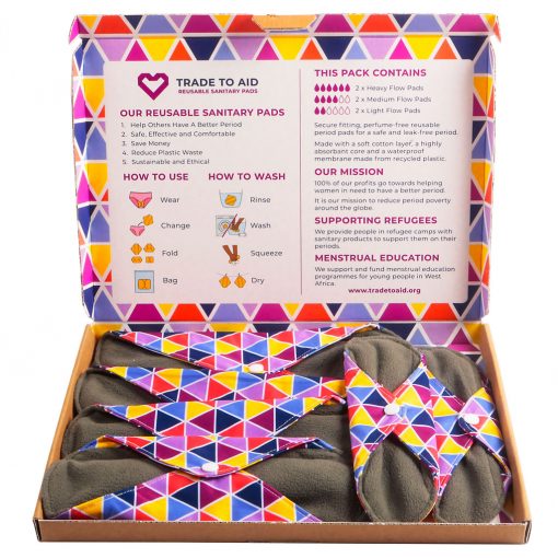 Trade to Aid sent us one of their packs which includes two light pads, two medium pads, two heavy pads and a waterproof wet bag. Priced at just £29.97 this set will last years compared to single use plastics.